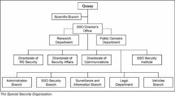 This organizational chart of the Iraqi Special Security Organization illustrates a hierarchy. Note the multiple separate layers to the organization's hierarchy; the lowest layer includes individual branches, the next layer involves supervisory directorates, which report to the director's office, who is accountable to the scientific branch.
