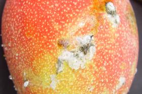 Young fruit and also blossoms can be damaged by powdery mildew (Oïdium mangiferae). This fungus grows during warm weather with high humidity. It attacks flowers and young fruits. A case of powdery mildew can dramatically affect the harvest. An open, well-ventilated orchard can prevent mildew. In acute cases, mildew can also be brought under control with sulphur. When carrying this out, there should be no wind blowing, and the leaves should still be moist with dew.