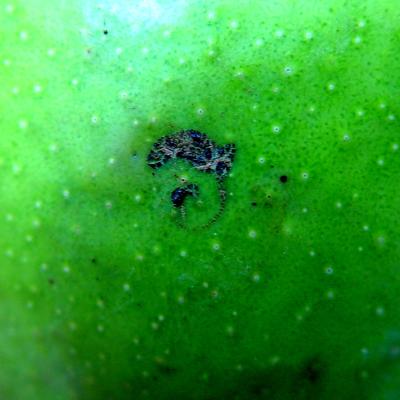 Egg of mango seed weevil on mango fruit. The very small egg laying scars are barely discernable at harvest.