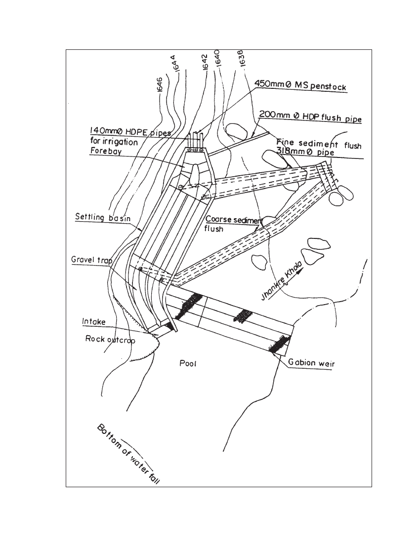 Figure 3.8 Headworks arangement of the 500kw Jhankre mini-hydro scheme, Nepal. Note that the intake, setting basin and the forebay are