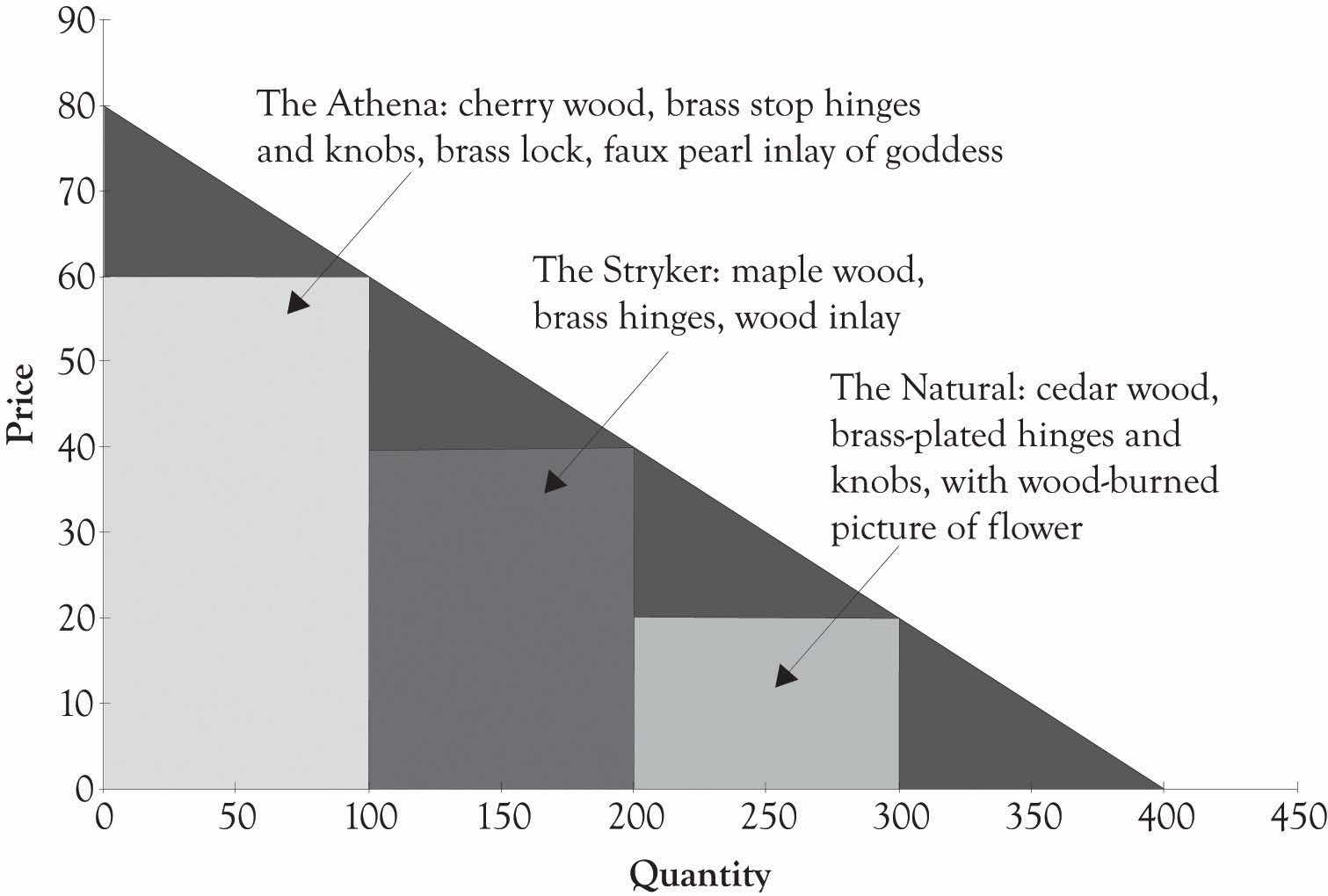 The Athena jewelry box is a high-end product targeted toward nonprice-sensitive consumers. It is part of what we refer to as a Midas product that was extravagantly engineered and designed. The Natural jewelry box is a Hermes product and is targeted toward price-sensitive consumers, and it was frugally engineered and contains basic features. The Stryker jewelry box is an Atlas product designed for the middle ground. The Stryker has several attractive features; yet it is still priced between Midas and Hermes versions. The Stryker is a mainstream version that appeals to the widest audience. Additional motivation behind the three versions will be presented in Chapter 5 "Examples of Product Differentiation & Versioning Curves".