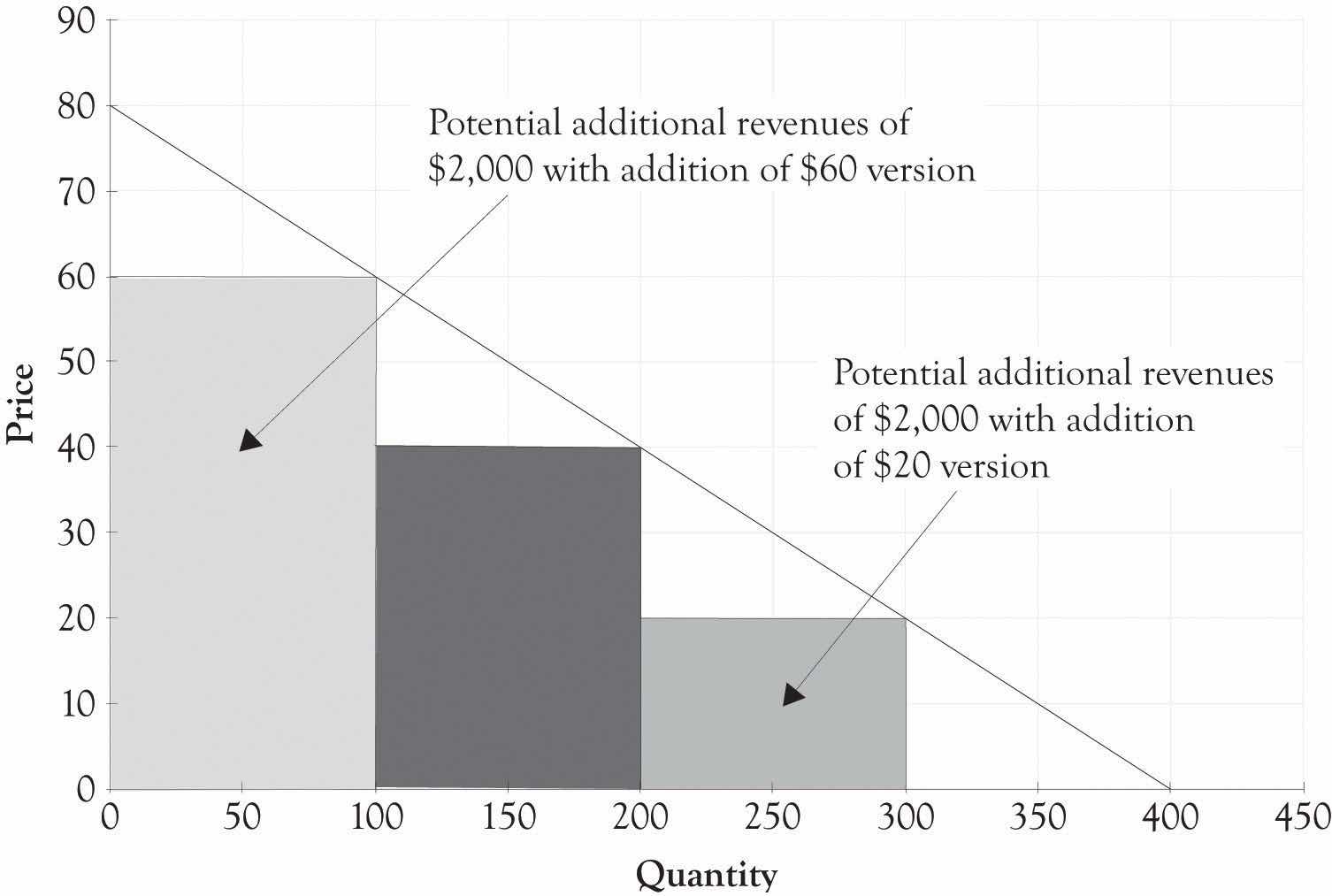Profit = ($60 − $30) × 100 + ($40 − $15) × 100 + ($20 − $10) × 100 − $2,000 ← {fixed costs} Profit = $3,000 + $2,500 + $1,000 − $2,000 Profit = $6,500 − $2,000 Profit = $4,500Notice that there are only 100 additional people purchasing the $40 box because 100 customers are now purchasing the high-end jewelry box for $60. There are also only 100 people who will purchase the low-end box. If Joan just adds the high-end box, her profit will increase from $3,000 to $3,500. If she just adds the low-end box, then her profit will increase from $3,000 to $4,000. If she adds both a low-end and high-end box, her net profit will increase from $3,000 to $4,500. The decision to expand and offer additional product versions is complex and will have a profound effect on her business model. She will of course examine her current operations and cost structure and make decisions on what versions, if any, that she will produce.