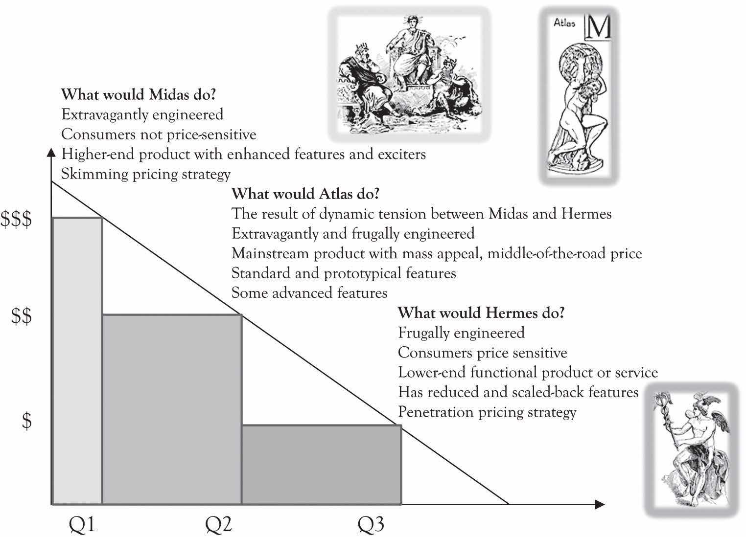 There is a part of the demand curve where the consumers are price-sensitive. This segment could include students, seniors, and, in general, individuals with low levels of discretionary income or individuals who are truly value-conscious. In designing products and services for this group, you can use the “What would Hermes Do?” approach. Hermes was the god of the traveler, the shepherd, the athlete, the merchants, the cunning, and was linked to invention and commerce. We are now designating Hermes as the patron for the part of the demand curve that does not have a patron.I realize that there are many patrons for this large segment of humanity. The goal is to have a question for the bottom of the pyramid. Please see Prahalad (2006) and many others who have been committed to this group. Hermes products and services are designed for consumers who are price-sensitive and demand features that are functional for the task at hand. Hermes products and services are still functional, but they have reduced and scaled-back features. There are a variety of very interesting products and services that have been developed for Hermes customers occupying the price-sensitive end of the demand curve. An important reason for offering Hermes products and services is to acquire customers who might eventually become Midas consumers. For example, students become less price-sensitive as they enter the work force and generate more discretionary income. Consumers’ tastes can also change as they become more familiar with a product line or because they get caught up in the hype around fashionable product. Designing Hermes products requires skills in frugal engineering.