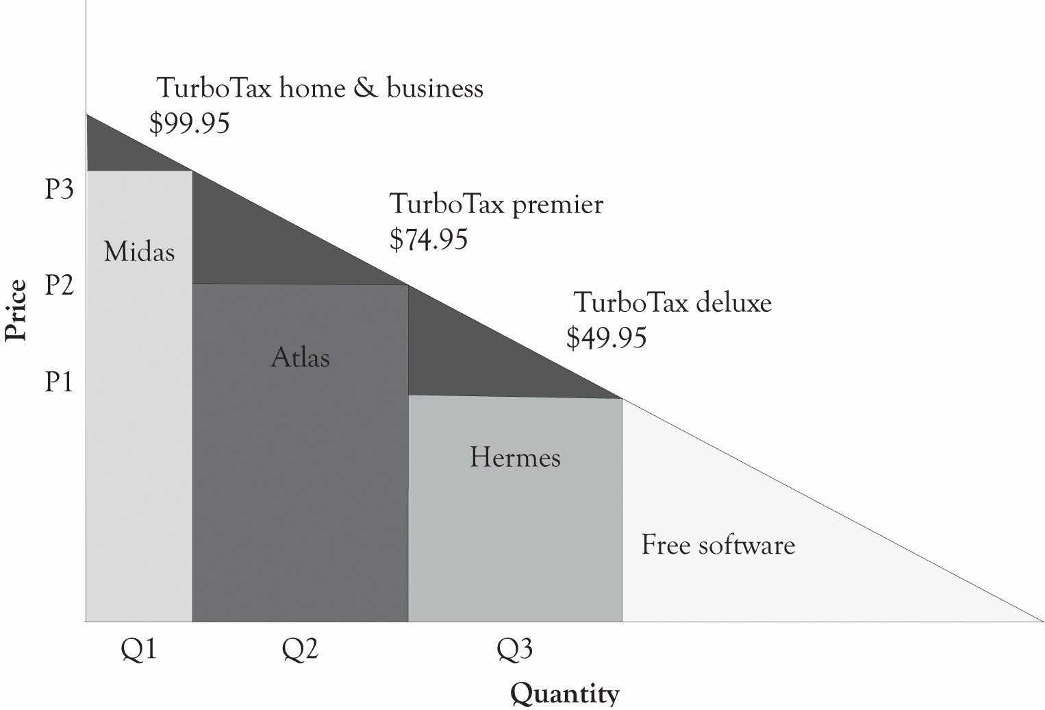 Low-end or Hermes products and services are designed for markets where the consumers are price-sensitive. These products have the essence of the prototypical product, but they are scaled back in order to meet the price sensitivities of this segment. These groups could include students, seniors, and, in general, individuals with low levels of discretionary income or even individuals who are value-conscious. Examples of products and services designed for the Hermes customers include TurboTax Free Edition, the Honda Fit and Tata Nano, and many of the large lot stores such as Sam’s Club, BJ’s, and Costco. Figure 4.4 "TurboTax Versioning" presents the all-to-familiar price and product versioning that is used by Intuit for TurboTax.