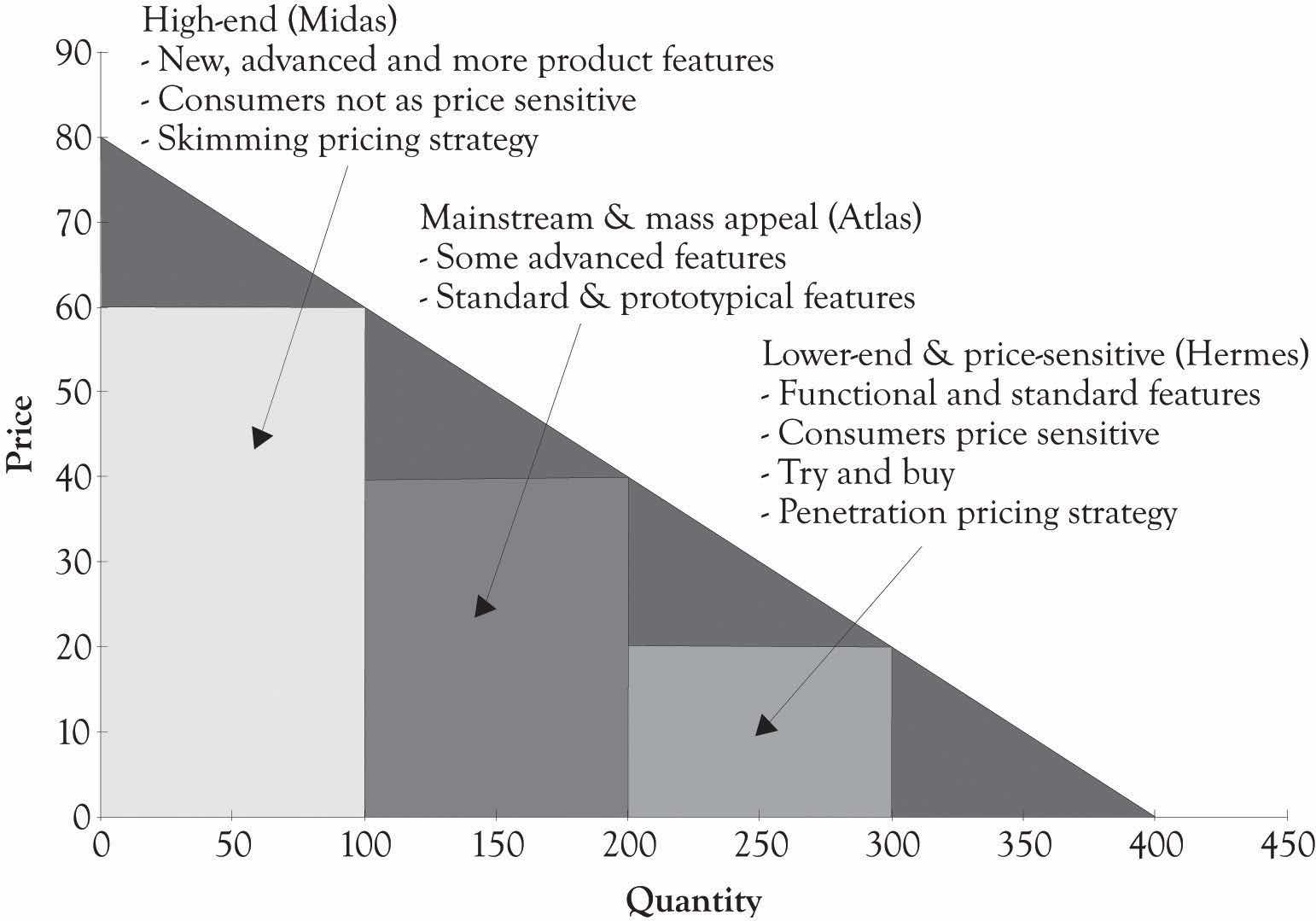 The three categories for product versioning and experimentation are the high-end or Midas product, the mass-appeal or Atlas product, and the low-end or Hermes product (see Figure 4.3 "Midas, Atlas, and Hermes Characteristics"). We will often use the terms version and product interchangeably; however, a version is usually related to a particular product. The Midas product is targeted toward the consumer who is not price-sensitive and is interested in many different features. Midas products might have an extended warranty or may be bundled with other products and services. Examples of Midas products include Cadillac, Acura, Lexus, TurboTax Premier, and specialized boutique stores. Sometimes, a Midas version is not even different than the Atlas version of a product or even the Hermes version of a product. Marketing efforts via branding may have infused the notion that the product is better than another product with the same features. This happens in the commodities markets, the car-rental business, and in electronics markets where standardized products such as CDs and DVDs are being sold.