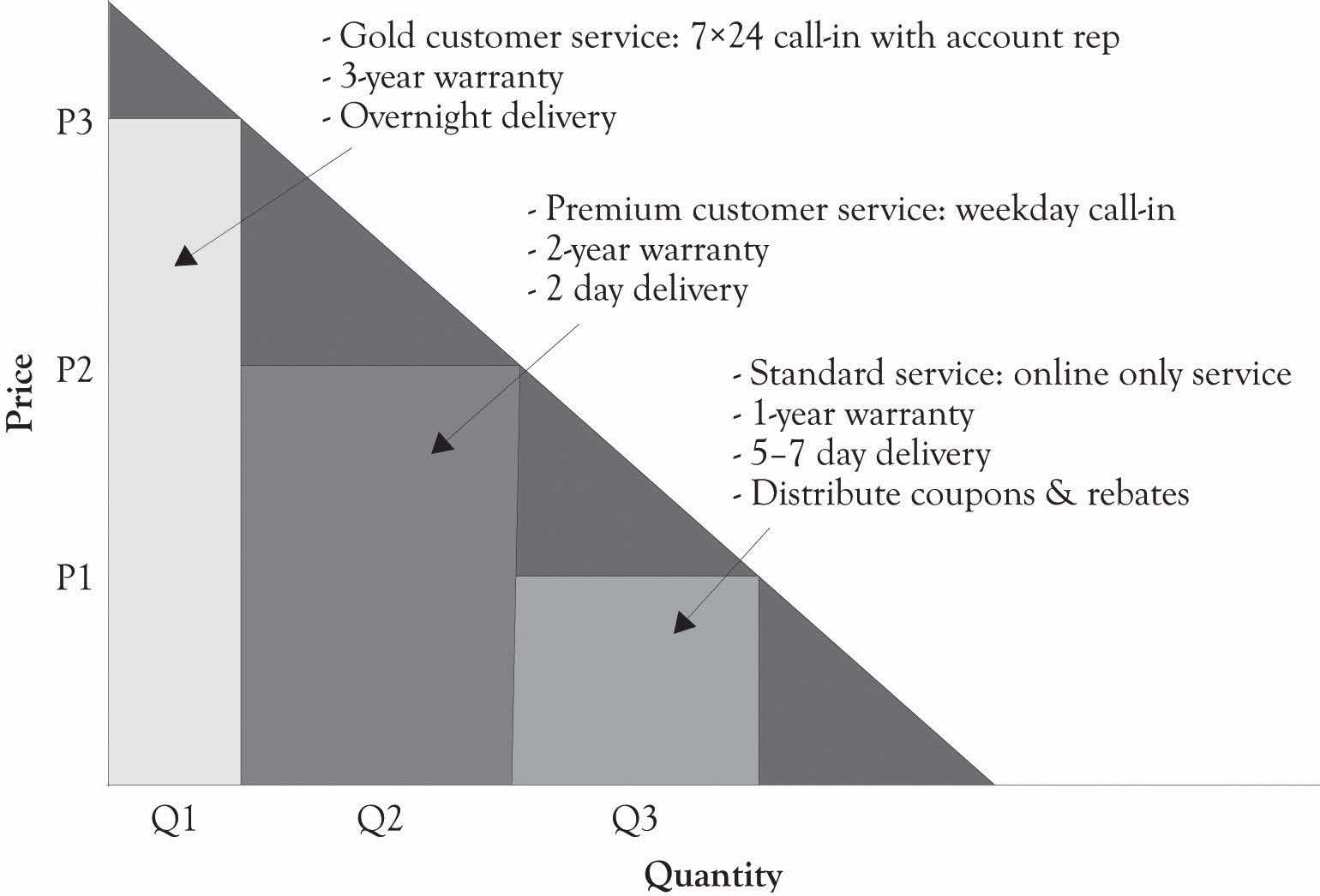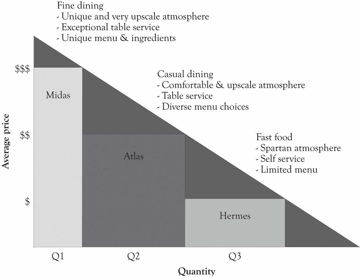 Competition in the restaurant, hotel, bars, and motel businesses is fiercely monopolistically competitive. Typically, these businesses compete on atmosphere, the level of service, and the uniqueness of their offerings. A Midas high-end hotel can have boutique rooms, spas and fitness rooms, and a vast array of food choices from room service to expensive high-end dining. In contrast, the Hermes hotel can be clean, Spartan, and in close proximity to fast food and casual dining outlets. The drama is in the details. Fresh flowers in the room, a free breakfast, and free cookies can attract customers. In most instances, the benefits of a given differentiation strategy are transitory, and new features have to be added or existing features need to be refreshed in order to compete effectively. Figure 4.5 "PD Curve for Restaurants" illustrates a PD curve for fast food, casual dining, and fine dining restaurants.