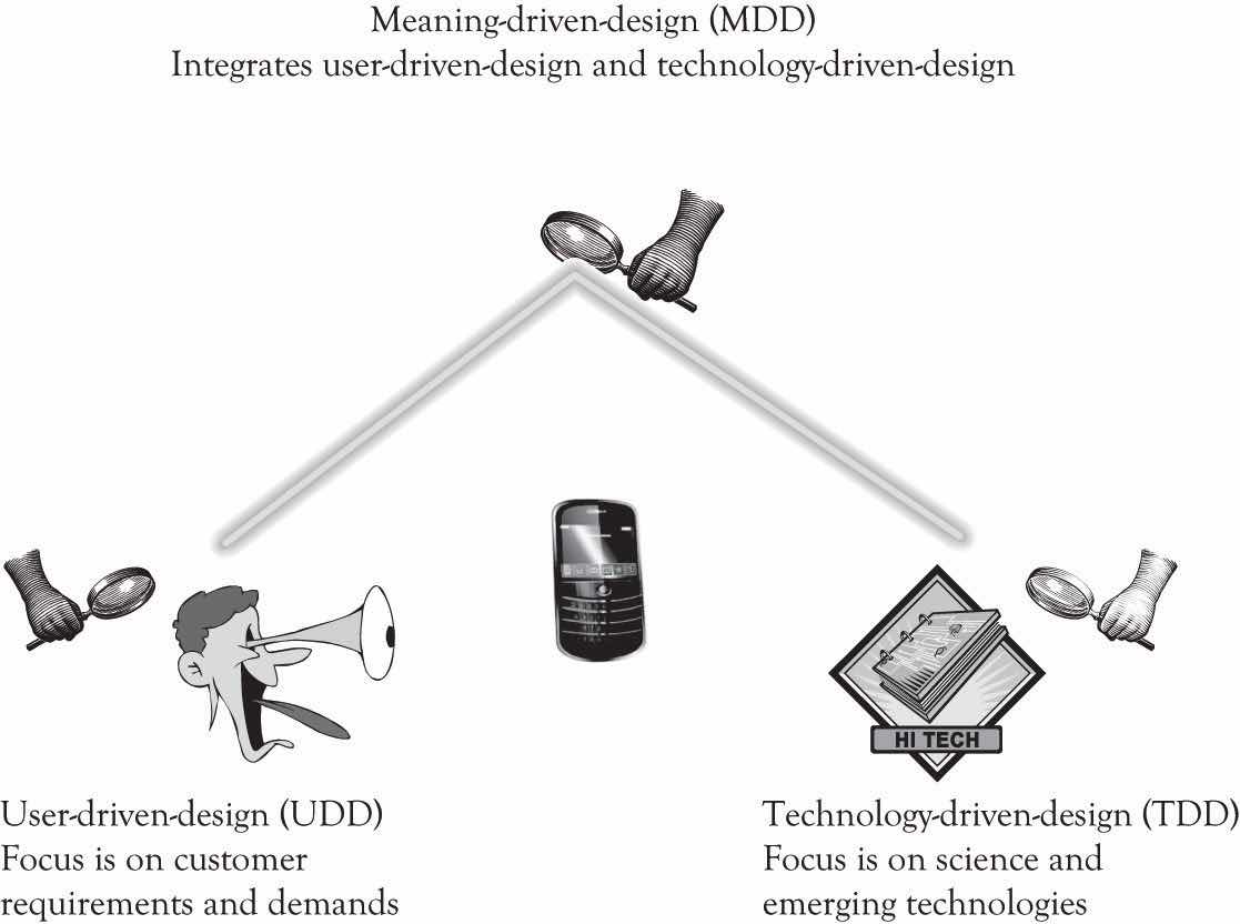 There are three fundamental approaches to design (Figure 7.2 "Fundamental Design Approaches"). The user-driven design (UDD)Design approach focused on researching consumer wants and needs. school is focused on researching consumer wants and needs. The technology-driven design (TDD)Design approach focused applying new and emerging technologies to develop products and services. school is not a school per se, but rather an approach that is focused on applying new and emerging technologies to develop products and services. The meaning-driven design (MDD)Design approach focused on the emotional and psychological relationships that people have with things, objects, and products and attempts to design products that satisfy these meanings. school focuses on the emotional and psychological relationships that people have with things, objects, and products and attempts to design products that satisfy these meanings. Most products can be designed using all three approaches, for example, software, custom houses, furnishings, electronics, clothes, personal care, appliances, and transportation. Some products such as CPUs’ semiconductors and nanotechnology and health equipment are primarily technology driven.