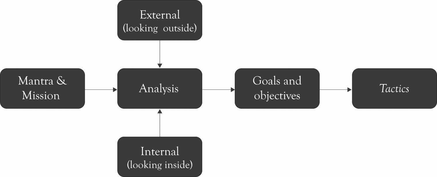 Planning can be accomplished in a variety of ways. Figure 8.1 "The Planning Process (Adapted from May)" presents a typical model of the strategic planning process.Adapted from May (2010). The mantraAn often-repeated phrase that provides the basis for a company’s existence. is an often-repeated phrase that provides the basis for the existence of the company. It is a slogan, a watchword, a byword, or a motto that breathes life into the firm’s existence. The mantra is not a replacement for the mission statement. The missionAn overall view of the business at an abstract level. It describes what the company does, why it exists, and how it satisfes customer needs. statement is an overall view of the business at an abstract level. It describes what the company does and why it exists and how it satisfies customer needs. The mission statement can also include a statement reflecting whether the company will focus on product differentiation and niche markets, focus on being price-competitive, or focus on both. The mantra and the mission are rarely static but ever-changing and emerging throughout the life of the firm.
