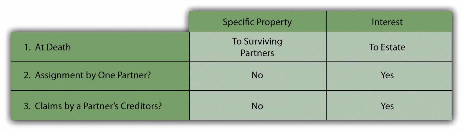 Suppose that Able, who contributed the building and grounds on which the partnership business is conducted, suddenly dies. Who is entitled to her share of the specific property, such as inventory, the building, and the money in the cash register—her husband and children, or the other partners, Baker and Carr? Section 25(1) of UPA declares that the partners hold the partnership property as tenants in partnershipUnder UPA, how partnership property is held by the partners: jointly.. As spelled out in Section 25(2), the specific property interest of a tenant in partnership vests in the surviving partners, not in the heirs. But the heirs are entitled to the deceased partner’s interest in the partnership itself, so that while Baker and Carr may use the partnership property for the benefit of the partnership without consulting Able’s heirs, they must account to her heirs for her proper share of the partnership’s profits.