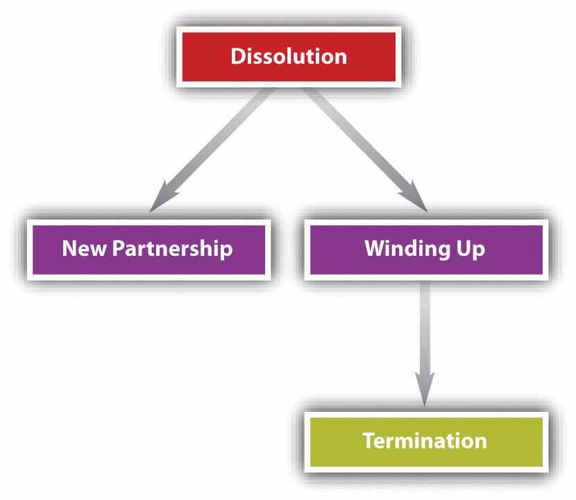 People in business are sometimes confused about the meaning of dissolutionA legal severance or breaking up; under UPA the change in relations caused by a partner’s withdrawal from the firm.. It does not mean the termination of a business. It has a precise legal definition, given in UPA Section 29: “The dissolution of a partnership is the change in the relation of the partners caused by any partner ceasing to be associated in the carrying on as distinguished from the winding up of the business.” The partnership is not necessarily terminated on dissolution; rather, it continues until the winding up of partnership affairs is completed, and the remaining partners may choose to continue on as a new partnership if they want.UPA, Section 30. But, again, under UPA the partnership dissolves upon the withdrawal of any partner.