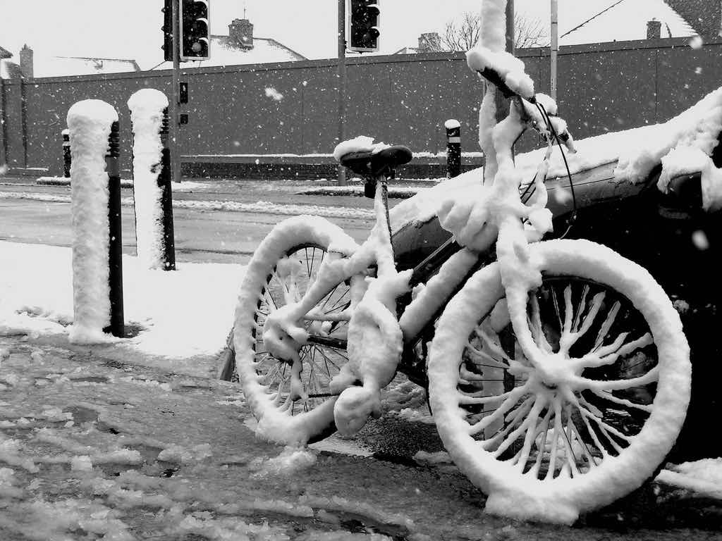 For some commuters, the bike became an option. In the abstract—sitting in a warm room reading about it—the possibility doesn’t sound so bad, get some good exercise and brisk fresh air on the way to work and back. There are real problems, though. The air can be dangerously cold and streets in winter are icy. It also needs to be remembered that the sun goes down early in December, so people biking home at night along the roadside are pedaling in the dark. Falls are common. Falls in front of oncoming cars are especially bad.