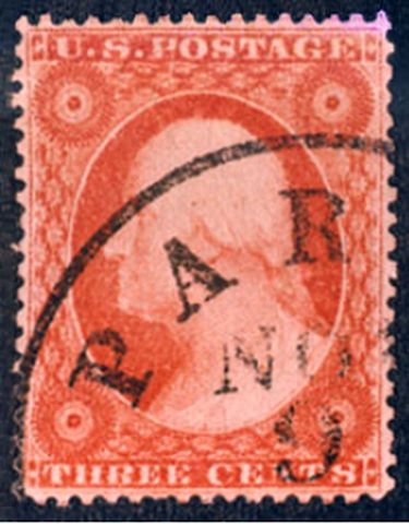 English: US Postage stamp, Washington, 1857 issue, 3c, 1st officially perforated issue.